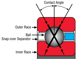 An axial force applied to the inner race from right to left is passed from the race to the ball at point B in the drawing below. It is then transmitted through the ball to point D where it passes into the outer race and support structure. The line of action BD forms a nominal 30° angle with the radial centerline of the bearing. Because of the elastic deformation of the ball and the race grooves along the load-transmission line, the ball load is relieved at points A and C, permitting smooth rotation around an axis perpendicular to line BD. With an axial force applied to the inner race from left to right, a similar transmission of load occurs between points C and A.
