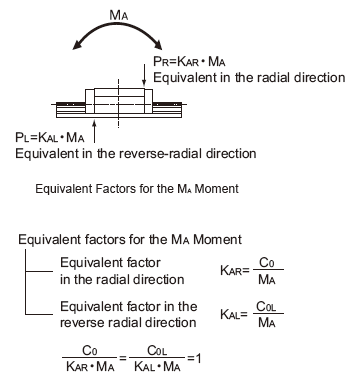 With those models other than 4-way equal load types, however, the load ratings in the 4 directions differ from each other. Therefore, the equivalent factor values for the M A and M C moments also diff er depending on whether the direction is radial or reverse radial.